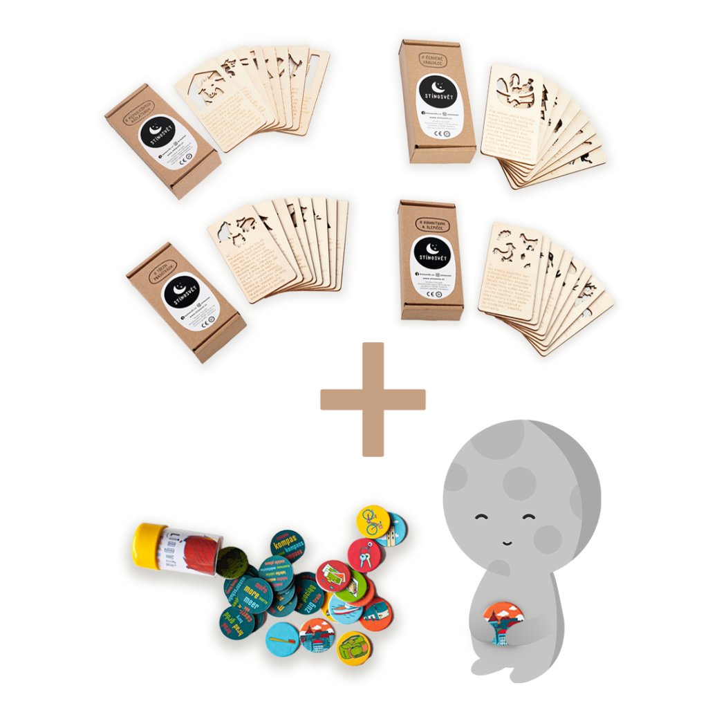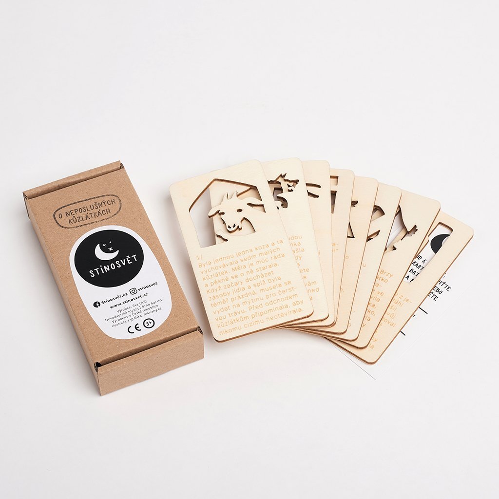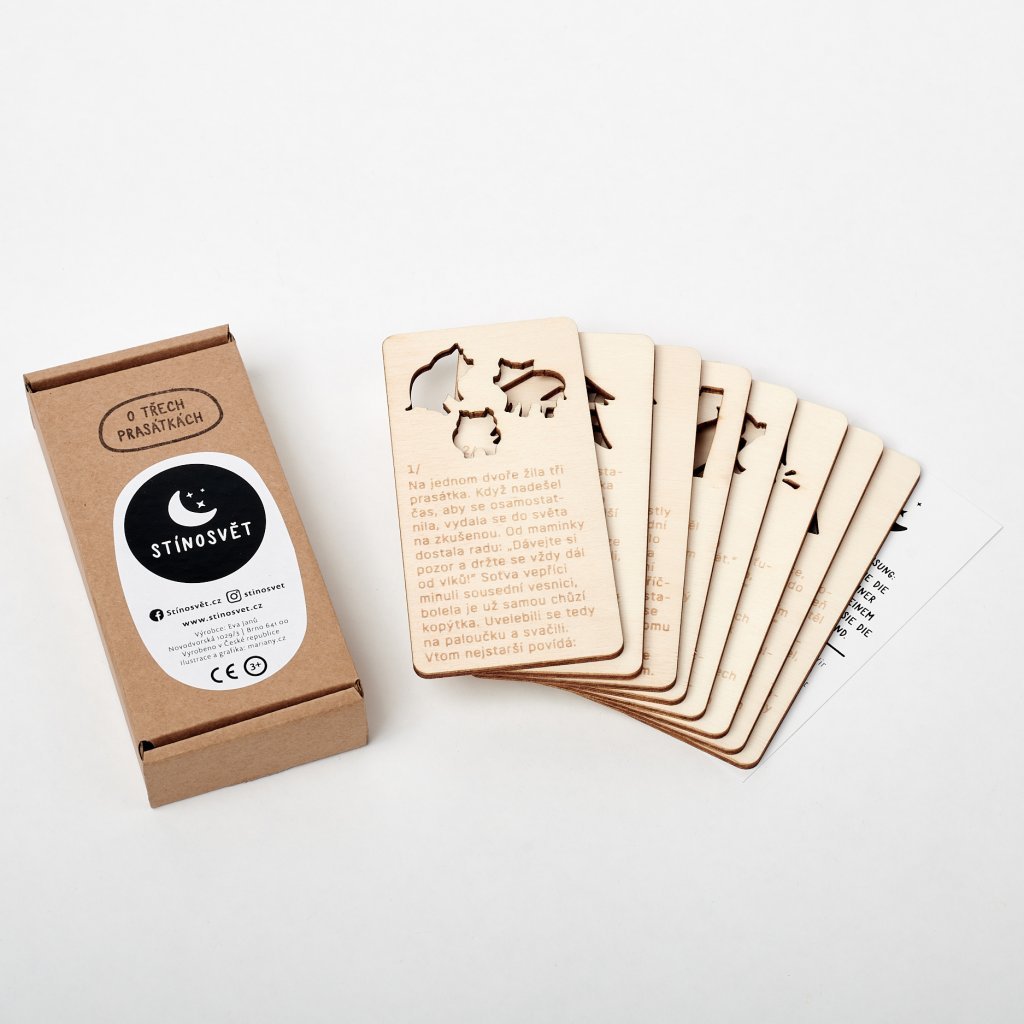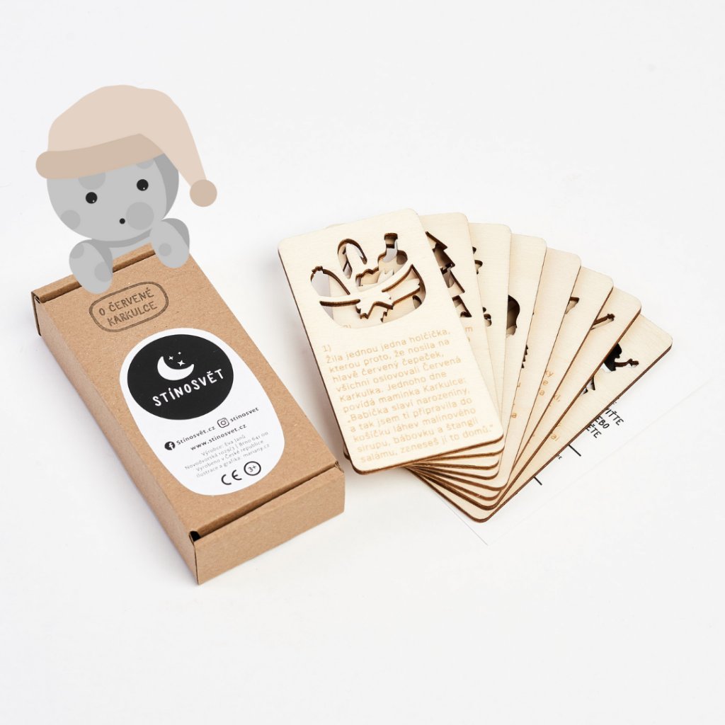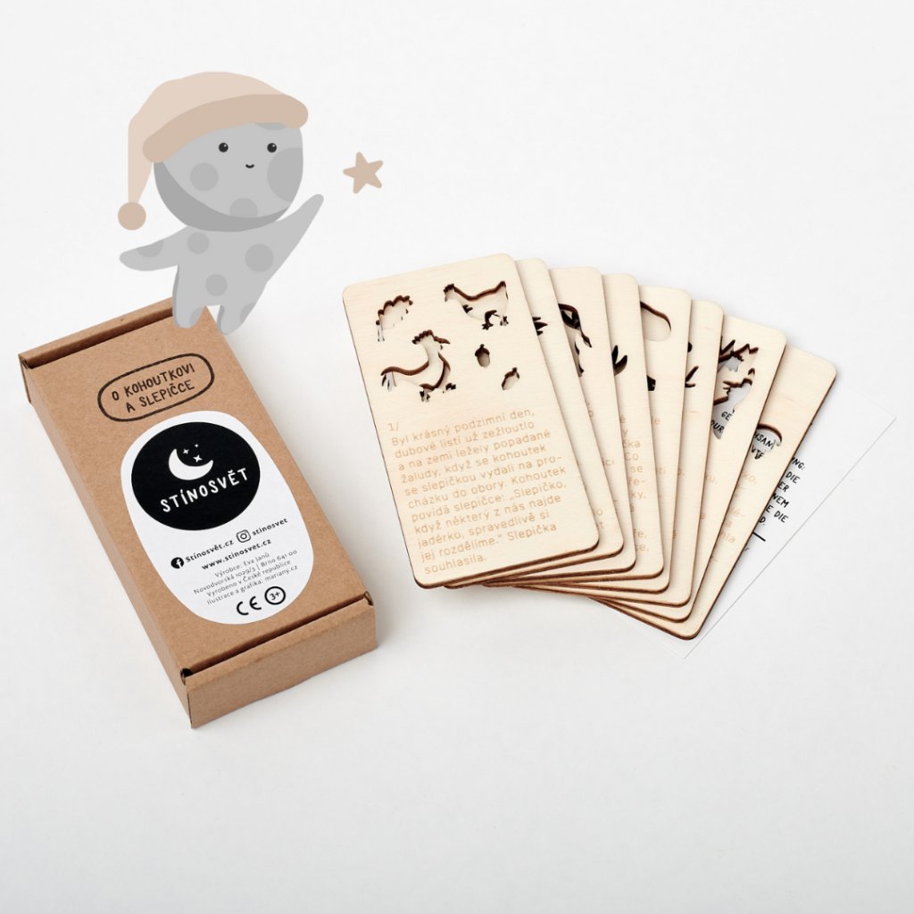Stínosvět, to jsou kouzelné dřevěné pohádky na dobrou noc, které rozzáří celý pokojíček! Stačí vzít kartičku s pohádkou, prosvítit ji mobilem, baterkou nebo lampičkou, a sledovat, jak hra světla a stínů vypráví příběh přímo na zdech. Zabaví každé neposedné dítko a promění večerní rituál ve skutečné dobrodružství. Vydejte se s dětmi do světa plného fantazie – zábava zaručena!